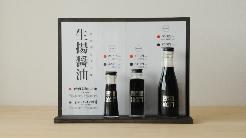 職人醤油の前橋本店と松屋銀座店では生揚醤油の量り売りをしています。専用のビンを用意していますので、2回目以降に空ビンをお持ちいただければ、醤油の価格のみでお渡しをすることができます。