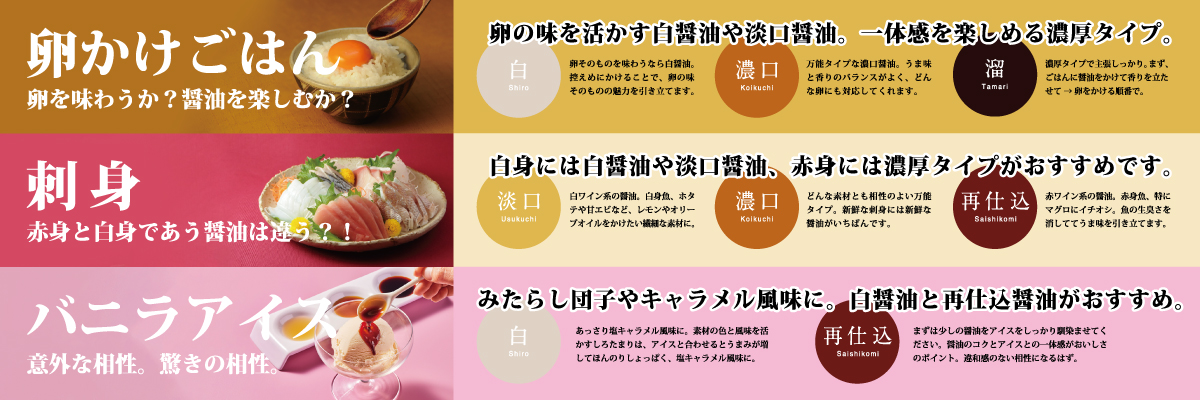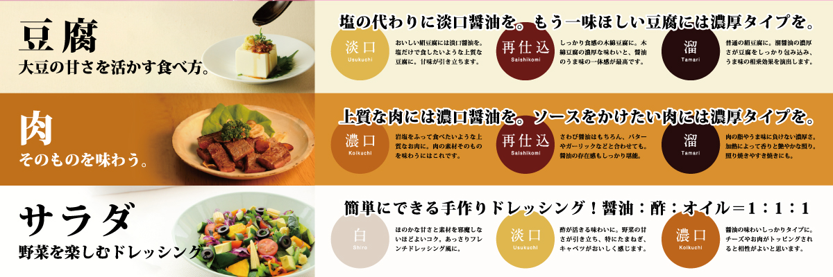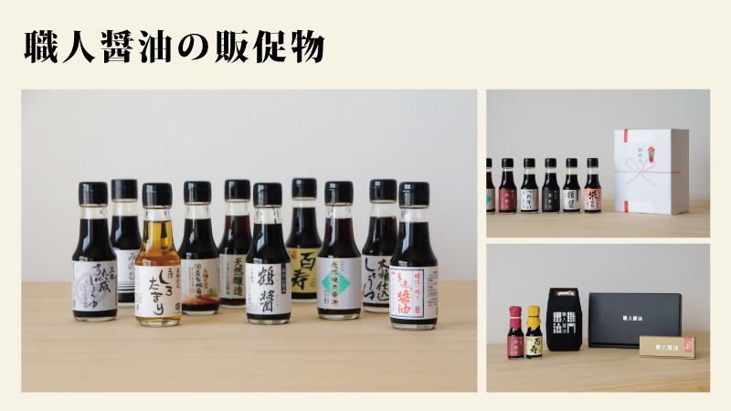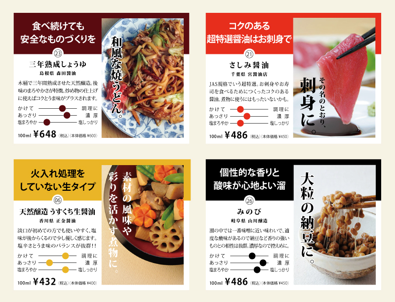 職人醤油100mlを2本並べた時の横幅にあわせたPOPです。基本情報に加えておすすめの使い方の料理写真を添えていますので、より直感的に醤油をお選びいただくことができると思います。サイズ:94mm×70mm