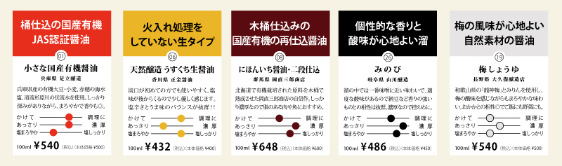 職人醤油100mlの横幅にあわせたPOPです。 商品名や価格など基本的な情報を掲載しています。醤油の種類で色分けをしているので、同じ種類を隣同士に並べていただく分かりやすくなると思います。サイズ:47mm×70mm