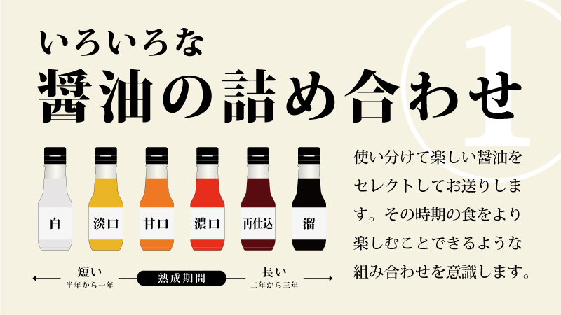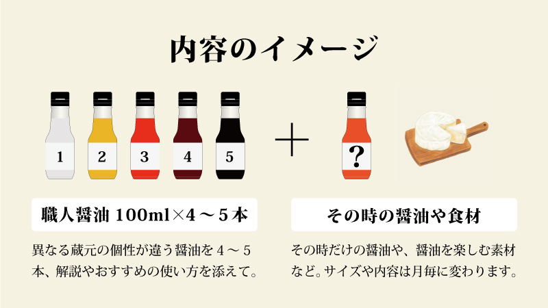 醤油6本程度が基本仕様です。内訳は既存の職人醤油100mlを季節の食に応じて4本~5本。そして、その時だけの醤油や食材を追加します。