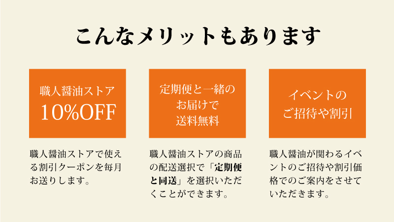 職人醤油ストアで使える10%OFFクーポンをお送りします。そして、いつものお買い物の配送方法を「定期便と同送」に選択いただけます。送料を気にせずに、お好みの商品を1本からお選びいただけると思います。