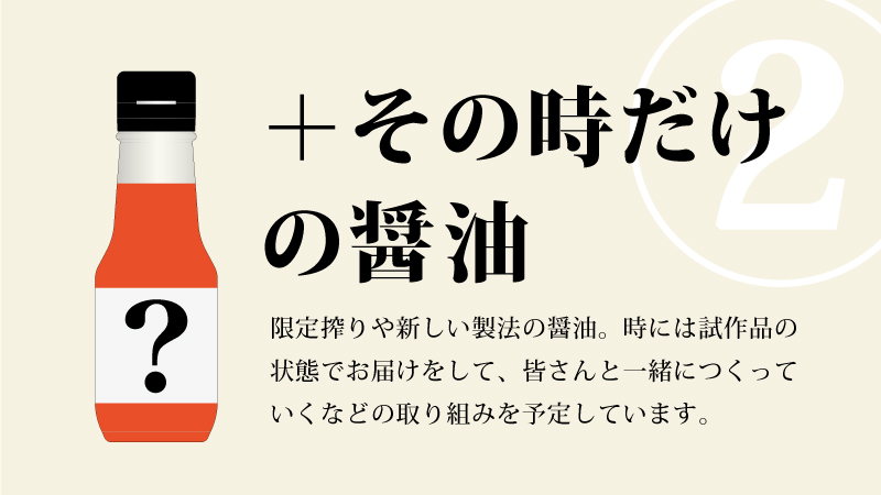さらに、その時だけの特別な醤油や、醤油を楽しむ食材を追加。限定搾りや新しい製法の醤油、時には試作品の状態でお届けをして、皆さんと一緒に商品づくりをしていくなどの取り組みを予定しています。