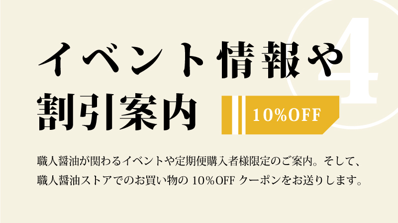 そして、オンラインとリアルなイベントなど、職人醤油が関わる催しへのご招待や割引価格でのご案内をさせていただきます。