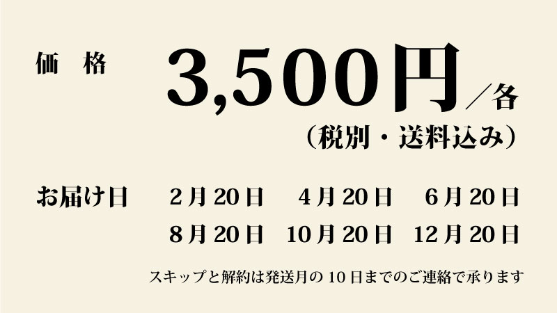 偶数月の20日がお届け日となります。お休みする月の10日までにメールにてご連絡いただけましたら、費用負担 0円でお休み(スキップ)いただけます。